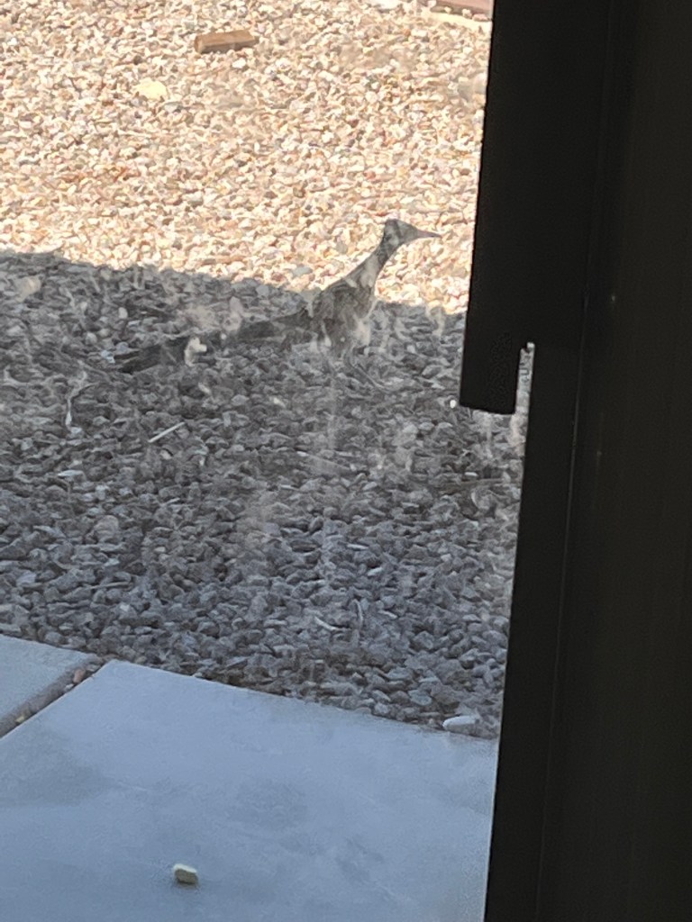 “I’m only here on a visa…” Toni started. The roadrunner, certain that he wasn’t about to be eaten and therefore done with this little rendezvous, pecked Toni in the shoulder, dropped to the ground, took off.